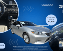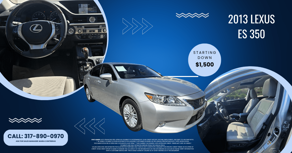 JTHBK1GG4D2030574Disclaimer: Auto financing pre-approval eligibility is determined by your credit history, income, employment, and debt-to-income ratio. ** Bi-Weekly payment of $291.32 estimate for qualified customers is based on 18% Annual Percentage Rate ( APR), $1,500 down, Documentation fee of $199 and a 66 month loan term.** This is merely an example. With approved credit. Terms may vary. Bi-weekly payments are only estimates derived from the vehicle price.