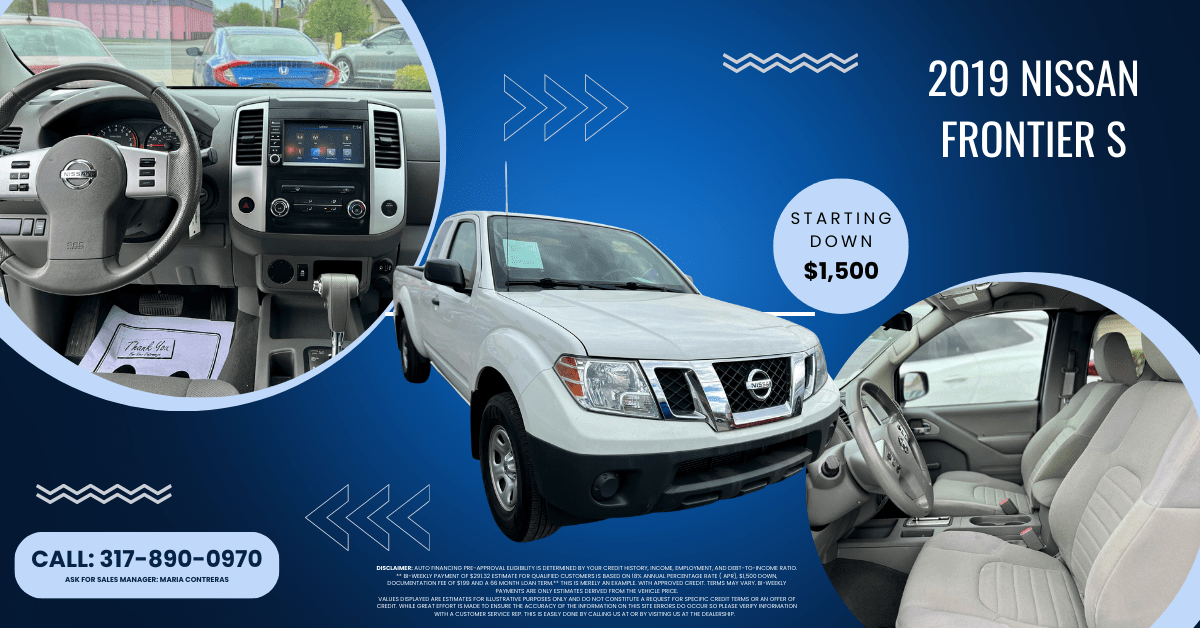 1N6BD0CT2KN739196Disclaimer: Auto financing pre-approval eligibility is determined by your credit history, income, employment, and debt-to-income ratio. ** Bi-Weekly payment of $291.32 estimate for qualified customers is based on 18% Annual Percentage Rate ( APR), $1,500 down, Documentation fee of $199 and a 66 month loan term.** This is merely an example. With approved credit. Terms may vary. Bi-weekly payments are only estimates derived from the vehicle price.